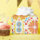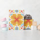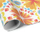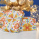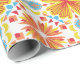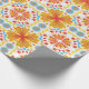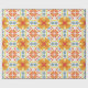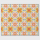 Papel de embrulho colorido com um padrão simétrico de flores laranja e amarelas com detalhes em azul. Mostrado desenrolado e plano, transmitindo vivacidade e alegria.