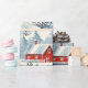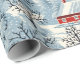 Um natal vintage que envolve papel apresentando uma paisagem de inverno nevada com casas vermelhas é um design charmoso e nostálgico que captura a essência de uma estação de férias clássica. As principais cores utilizadas neste papel de embalagem são o azul claro, o vermelho, o branco e o preto, criando uma cena bela e festiva.