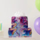 Colorido, caprichoso, engraçado palhaço rosa tocando corneta com uma coruja expressiva e notas musicais alegres, flores, folhas em cores vibrantes vermelho, fúcsia, violeta, roxo, azul, branco, pintura em aquarela por Bulgan Lumini (c)
