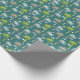 Um meio século, padrão retrô de palmeiras brancas, verdes e castanhas-claras e nuvens brancas e azuis, contra um fundo verde-escuro.