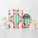 Este papel de embrulho personalizado apresenta um tema de Natal festivo. Uma imagem de um gengibre ilustrado fofo é colocada no centro de um círculo de hortelã. Uma saudação de Feliz Natal é impressa por cima do pão-de-gengibre com a palavra "Feliz" impressa num padrão de brilho dourado, e "Natal" impresso num padrão de canas listradas vermelhas e brancas. Um nome de exemplo é impresso abaixo do gingerpão que você pode personalizar para incluir seu próprio nome personalizado ou texto. O plano de fundo apresenta um design verde e branco de pinstripe.