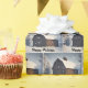 Um celeiro de madeira russo no inverno com texto Feliz Feriado, árvores congeladas e flocos de neve.