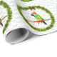 Uma pintura bonita de um Conure Nanday (o próprio papagaio do artista era o modelo), sentada sobre uma faixa vermelha e verde vestindo um chapéu de Papai Noel, e colocada dentro uma coroa de férias. O fundo deste papel de embrulho de Natal tem um padrão repetitivo macio de folhas ocas desbotadas.