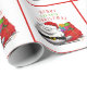 O papel de embrulho de Natal bobo apresenta um gato com má atitude, vestindo um chapéu de Papai Noel e parado na frente de um saco de presentes. O texto acima dele diz "Feliz Freakin' Christmas".