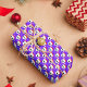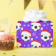 Este papel de embrulho de Natal apresenta bolas de futebol vestindo Papais noeis com flocos de neve girando sobre um fundo roxo de Natal.