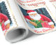 Este papel de embrulho muito elegante apresenta uma bela ilustração original de Papai Noel trazendo presentes sob a neve. A mensagem Feliz Natal está escrita de forma elegante em letra caligráfica. O nome do remetente é personalizável. Cores principais: vermelho e ouro.