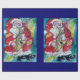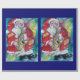 Pintura colorida, branca e artística em acrílico, Papais noeis estão tocando violino na noite de inverno nevada, coruja, ornamentos florais, plantas de inverno, bagas holly em cores vermelho vivo, verde, branco, azul, amarelo. por Búlgaro Lumini (c)