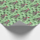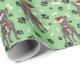 Uma imagem de um adorável Bulldog Francês vestindo um Papai Noel vermelho e branco que é a característica no padrão deste papel de embrulho de presente de Natal. O cachorro se coloca em meio a um padrão de estampas pretas e ossos brancos, e se repete em um claro fundo verde de Natal.