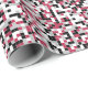 Este papel de embrulho apresenta um padrão geométrico colorido na moda Viva Magenta, preto, cinza e branco, com grade branca. Os quadrados são coloridos em um padrão aleatório e você pode editar as cores na ferramenta Design.