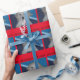 Um belo recuperador de ouros rodeado de diferentes tons de azul. Seasons Saudações acima da foto.