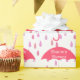 Papel de embrulho de chá de fraldas ou chá de panela, feito em branco, com um padrão de chuva rosa grande e guarda-chuvas cor-de-rosa. Personalize o texto em branco para o evento do seu chá.