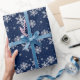 Papel de envolvimento elegante do feriado feito em azul escuro, com os gráficos dos flocos de neve de prata do brilho. Grande papel do Natal com para fora a confusão do brilho. Personalize para adicionar seu próprio texto.