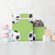 O papel de envolvimento mostrado com uma bola de futebol dos esportes imprime em um fundo verde. Personalize este artigo ou compre-o como é.