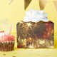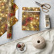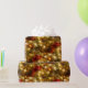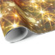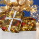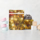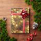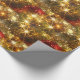 Papel brilhante de embrulho de Natal com bolhas de Natal vermelhas e ouros, luzes cintilantes, galhos de galinha e ramos de árvores de Natal