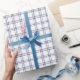 Um papel de embalagem projetado com um padrão de xadrez azul moderno de marinho em branco. Personalize o fundo branco entre outras opções.
