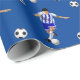 Papel de enrolamento mostrado com um impressão de jogador de futebol em um fundo azul e bolas de futebol. Personalize este item ou comprar como está.