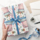 Este delicioso papel embrulhado apresenta um padrão caprichoso cheio de alegria de férias. Adorada com uma meia rosa macia, decorada com verde e bastões de canela, ela apresenta belos presentes embrulhados, canas doces e ornamentos, capturando a essência de uma celebração mágica de Natal.