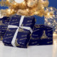 Este papel folheado festivo, personalizado, azul marinho e ouro Feliz de Natal tem um tom de ouro, Natal ou Árvore de Natal, com fitas e poeira de estrelas. Se precisar de itens correspondentes ou se precisar de assistência ou alterações, envie um e-mail para niteowlstudio@gmail.com.