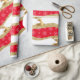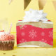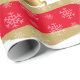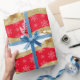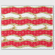 Papel de embrulho mostrado em grandes linhas brilhantes de cor vermelha, branca e dourada mate com rena de ouro mate e flocos de neve brancos sobre faixas. Papel correspondente mostrado. Cor: Vermelha, Branca e Dourada Matte. Personalize este item ou comprar como está.