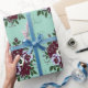EN : Elevate your gifts with this premium wrapping paper featuring a refined floral pattern. The design showcases an elegant repetition of your signature bouquet of burgundy roses and lilac pansies on a soothing seafoam green background. Perfect for wedding gifts, birthdays, or any special occasion.