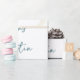 Um lindo padrão floral azul, branco e dourado, também personalizado com nomes de noiva e noiva. Concebidos para chá de panela ou casamento, aniversário e afins.