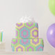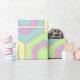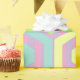 Este papel de embrulho tem um design geométrico de hexágonos em azul claro, amarelo pálido e verde pálido num campo de listras em rosa pálido e roxo pálido.