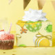 Um desenho animado de galinha Páscoa, bonito, com olhos azuis, segurando um ovo verde-claro de Páscoa com flores pequenas, fita amarela e lindos ovos brilhantes de Páscoa em padrões amarelo e verde. Felz pascoa!