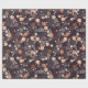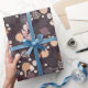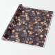 Aproveite a alegria do Natal! Este papel de embrulho de Natal tem pássaros engraçados com chapéus, decorações, pinos cones, flores e folhas em cores marrom e laranja em fundo castanho-escuro.