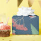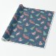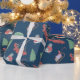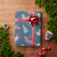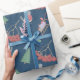 Papel de embrulho de Natal azul com um charmoso design de árvores de abeto, pássaros vestidos em suéteres com algas, folhas verdes e ocas, espíritos de bagas sagradas e mangas cheios de presentes de Natal para adicionar um toque único e caprichoso ao seu presente de Natal este ano.