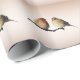 Este papel de embrulho apresenta um par de palitos de casa tocados em um galho. O macho tem uma plumagem vermelha na cabeça e no seio. A fêmea é bronca e marrom com listras. Eles se destacam lindamente contra o fundo metálico de bronze.