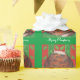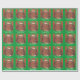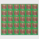 Um gato feliz e tortuoso (parecido com um pudim de natal!) senta-se sobre uma almofada verde contra um fundo com formato de folha vermelha e verde, e "Feliz Natal" escrito em branco sobre um fundo verde. Papel de embrulho de Natal bonito com um design personalizável para você personalizar com seu próprio texto, mensagem ou imagens. Imagem criada a partir de um desenho a lápis colorido original.