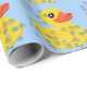 Adoráveis bolhas azuis e papel de embrulho de presente de chuveiro de bebê e festa de pato de borracha amarelo brilhante.