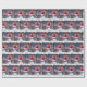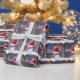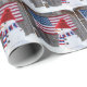 A happy snowman, wearing a vibrant red beanie and a stylish striped scarf in patriotic shades of red, white, and blue, proudly positioned in front of a rustic wooden barn that showcases an American flag