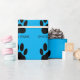 As pegadas do cão. Papel de embrulho personalizado para presentes de cão. Cor preta num fundo azul. Edite o nome do cão para personalizar este papel de empacotamento.