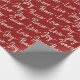 A design neste papel de embrulho de presente de Natal é a na moda de palavras manuscritas "Peace-Love-Joy" repetidas de ponta a ponta. O texto aparece em branco sobre um fundo vermelho.