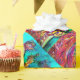 Pintura aquosa branca e colorida em cores vermelhas, fuchsia, cor azul-lacre amarela com ouro e folha prateada.