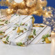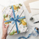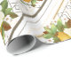 Peras inteiras e divididas com flores brancas e folhas verdes.