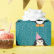 Pinguim de desenho animado bonito vestindo um chapéu de festa com um papel de embrulho de fundo confetti.