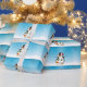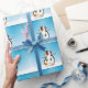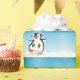 Uma bela ilustração do inverno: um pinguim com luvas e tocas de humor está caminhando na neve.