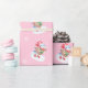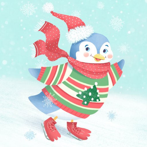 Um pinguim festivo de inverno desliza alegremente sobre o gelo enquanto flocos de neve delicados caem contra um fundo minúsculo rosa! Ilustração original de Noël Snow.