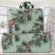 Um papel elegante e sofisticado de embalagem de férias com pinheiro branco misturado com ramos de árvore prateada com cones de pínus brancos e bagas vermelhas ilex carregadas na diagonal contra um fundo verde-sábio.