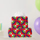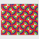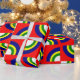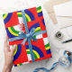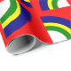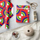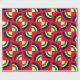 Este papel de embrulho tem um design de Bauhaus com quatro círculos em azul, amarelo, verde e branco num campo de vermelho.