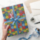 The quilt pattern showcases a vibrant mosaic of pinwheel and floral designs, with intricate patterns and a rich color palette that create a visually striking effect