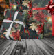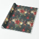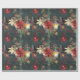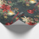Um papel festivo e luxuoso que inclui um fundo noturno de floresta verde, enfeitado com flocos de neve de ouro, poinsetos, lanternas e grampos de pínus, com um ornamento vermelho brilhante em queda de fita vermelha.