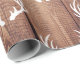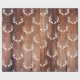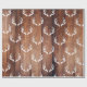 Papel de embrulho em madeira, de cor branca, com um padrão de chifres. O fundo é um design de tábuas de madeira de campo escuro.