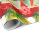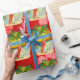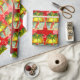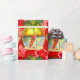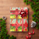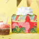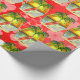 Boas festas dos Sandy Beach mornos de sua praia tropical favorita da ilha. Palmeira decorada com enfeites de natal e luzes, com uma prancha retro que inclina contra a árvore de Natal na parte dianteira um por do sol sobre o oceano. O fundo vermelho da cor do feriado de tartarugas e do hibiscus havaianos de mar de Honu floresce.