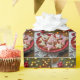Uma placa vermelha festiva exibe uma variedade de biscoitos com tema natalício, incluindo estrelas, árvores e Papais noeis