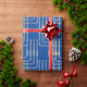 Um moderno papel de embrulho prateado, dourado e azul do Chanucá, contendo uma bela menorah prateada e dourada quadrada com velas iluminadas em um padrão geométrico.
