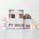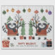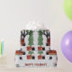 Prateleiras de inverno e árvores Feliz feriado Papel de Vestir de Natal que apresenta um guaxinim em roupas de inverno, árvores e ornamentos e presentes.