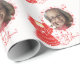 Foto personalizada e nome papel de embrulhamento de presente de prêmio de anjo de Natal apresenta um lugar vermelho coberto por um anjo sorridente segurando uma luz de vela. A bela vintagem lace motif de estrelas entrelaçadas e flores que lembra o antigo artesanato do fazer de rendas. Personalize com o nome e a foto usando o modelo fornecido. Nos especializamos em designs feitos por medida, então entre em contato conosco se você quiser um layout feito por encomenda exclusivo usando este design de anjo básico.
